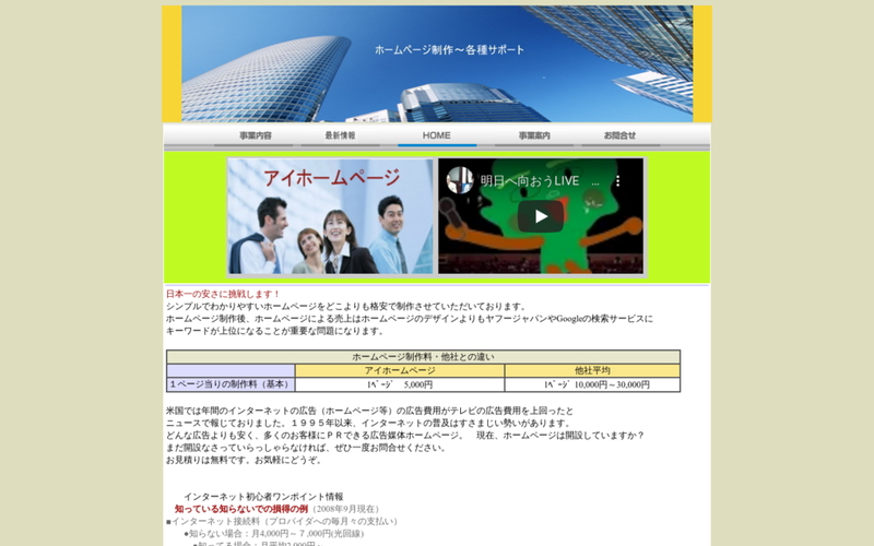 日本一の安さに挑戦しているホームページ制作会社です。ホームページを格安料金で制作することができます。IT関連知識が豊富なため節約ポイントなども提示してくれるので、まだホームページを開設していない人、これからホームページを開設しようかと考えている人に向いています。どんな広告媒体よりも安く、より多くの閲覧者を獲得するホームページ制作を目指しています。ヤフージャパンやGoogleの検索サービスに上位表示されるかどうかが閲覧者を増やす鍵になるため、単にホームページを開設するだけでなく、SEO対策やアクセス対策など集客を増やすサポートも行っています。パソコン初心者でも安心のパソコンサポートやパソコン講習も行っています。