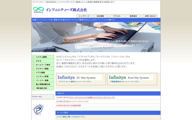インフィニティーズ株式会社は、東京都大田区に本社を置くホームページ制作会社です。主な事業として、ホームページの制作とリニューアル、システム開発と保守運用、アプリ開発などのサービスを提供しています。ホームページの制作においては、クライアントの要望に応じてわかりやすくて、シンプルなデザインのサイト作りを心がけています。また、同社が力を入れていることの1つはシステムの開発販売です。これまでに不動産業者向けホームページシステムや、オンライショップ向けECサイトシステムの販売を行っています。いずれのシステムもリーズナブルな値段です。アプリ開発に関しては、iPhoneやAndroid端末などのスマートフォン対応のアプリを開発しています。