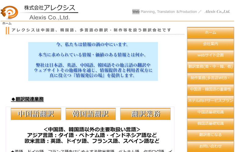 株式会社アレクシスは、Webサイトの制作や企画、広告事業、翻訳・DTP制作などを行っている会社です。東京都内のホテルと多く取引をしている会社で、ホテルなどの宿泊施設のホームページ制作はかなりの実績があります。多言語サイトの制作も得意で、日本語だけではなく英語や韓国語、中国語など様々な言語に対応したホームページを制作できます。数々のホームページの翻訳を行ってきた実績もあるため、すでにあるホームページを海外向けに翻訳して欲しいという要望にも応えてくれます。IllustratorやInDesign、QuarkXPressといったDTP対応ソフトの扱いにも長けているのも強みです。デザインはもちろん、フォントにも拘った高品質なホームページデザインを提案してくれる会社です。