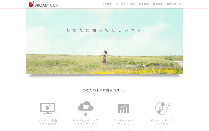 株式会社ブロードテックは東京都目黒区の制作会社です。コンテンツ制作・システム開発、サーバホスティング・クラウドサービス、プロモーションサービス、デジタルメディアプロダクツの制作を行っています。官公庁や企業のWebサイト制作に豊富な実績とノウハウがあります。Webサイト制作においては複数のCMSによる制作が可能。そのため、クライアントの導入環境、運用管理体制、予算等を考慮して最適なCMSの導入を提案することができます。レスポンシブWebデザインによるWeb制作が行われ、様々なデバイスに最適化されるとともに、SEOにおいても高い効果を発揮します。また、日本工業規格JIS X 8341-3:2010をWebアクセシビリティの指標としており、利用環境や年齢、身体的特徴などを問わずに利用できるように、アクセシビリティを考慮したサイトデザインをすることができます。