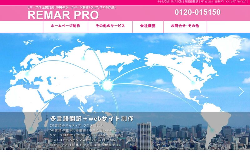 株式会社リマープロは、多言語対応サイトの構築を得意とするホームページ制作会社です。海外事業所を保有し、ネイティブ・クロス翻訳(20言語)と重訳(56言語)のサービスが提供できるのがこの会社の強みになっています。リマープロが独自に開発したCMSを利用すれば、リーズナブルな料金で制作から運用・メンテナンスまでワンストップで依頼できるので、ホームページにあまりお金をかけたくないという方も安心して始められます。企業のプログラムシステムやホームページ制作・海外サーバー設置管理などに長年関わってきた実績があるスタッフが在籍しているので、外国語のホームページの制作や自社用リクルートサイトの構築なども安心して依頼できます。