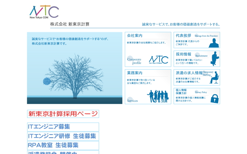 株式会社新東京計算は東京都府中市にあるIT企業です。ビジネスプロセスアウトソーシング、人材派遣、ロボティックプロセスオートメーションを事業領域としています。ウェブサイト関連では人材派遣部門でウェブサイト、ウェブ技術関連技術者の派遣を行っています。ウェブサイトを構築したいというクライアントの要望に応えて、経験豊富で高いスキルを持ったデザイナーやコーダーを派遣します。また、javaやSQLによるシステム開発に多くの実績があり、ウェブサイトを構築する際にjavaによる動的なページ作成、データベース連携が必要なサイト構築にも対応可能です。「調和を大切にすること」「挑戦し続けること」「人格を磨くこと」「森羅万象に慈しみの心を持つこと」を行動規範として、日々の業務に取り組んでいます。