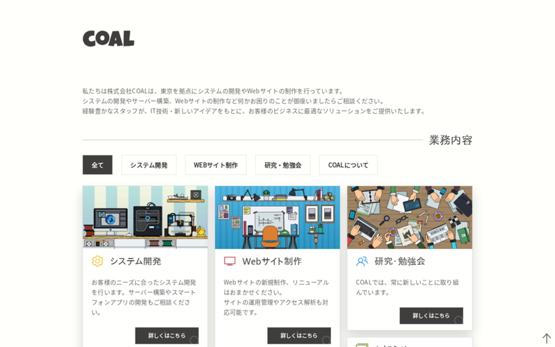 株式会社COALは、東京都品川区を拠点として活動している会社です。ホームページ制作やシステム開発を手掛けています。ホームページ制作では、大規模なコーポレートサイトから、問い合わせフォームの制作まで、WEBサイトに関する様々なサービスを提供することが可能です。訴求力が高く、実践的なサイトの制作を得意としており、運用や保守も行っています。また、システム開発では、快適で使いやすいユーザー目線に立ったソフトウェアの開発や、安全で効率的なシステムの構築をクライアントへ提供しています。イベント管理システムや予約管理システムなど、多種多様な実績を積む中で培ってきたノウハウを元に、ベストな解決方法を導き出すことができます。