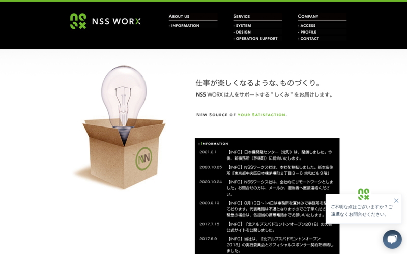 NSS ワークス株式会社は東京都中央区に本社を有するウェブサイト制作会社です。本社に加えて日本橋開発センターと秋田オフィスの運営をしています。ウェブサイト制作ではCMSサイト構築を得意とし、モバイルやスマートフォンに対応することも可能です。またシステム開発やシステムコンサルティングの業務も行なっているので、それらの分野が弱い会社には大きな力となります。会社の業務支援体制が整っており、 ISO認定支援業務なども充実しています。さらに企業向けセミナーやイベント運営も積極的に行っています。また社内業務システムの構築もできますので、システム部門の比較的弱い会社でも安心してウェブサイトを使った事業を進めることができます。